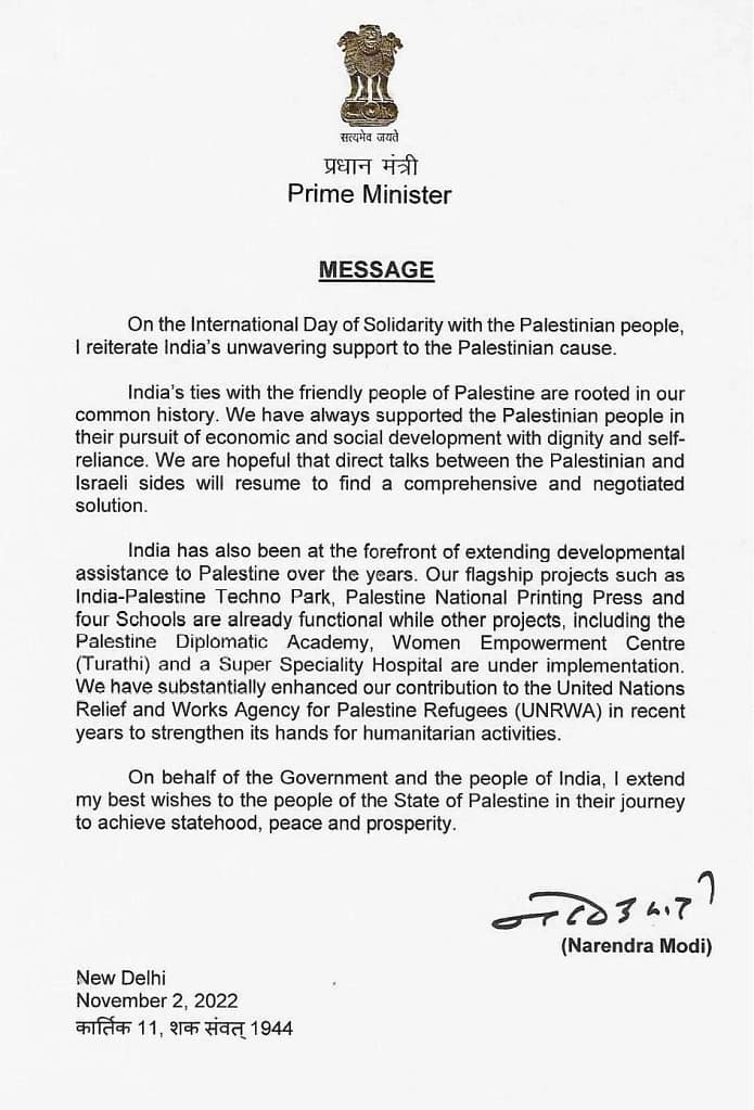 Prime Minister Narendra Modi expressed India’s unwavering support for Palestine in a letter commemorating the International Day of Solidarity with the Palestinian People on November 26. He highlighted India’s deep concern over the ongoing security and humanitarian crisis, emphasizing the necessity for an immediate ceasefire, the release of hostages, and the cessation of terrorist acts.